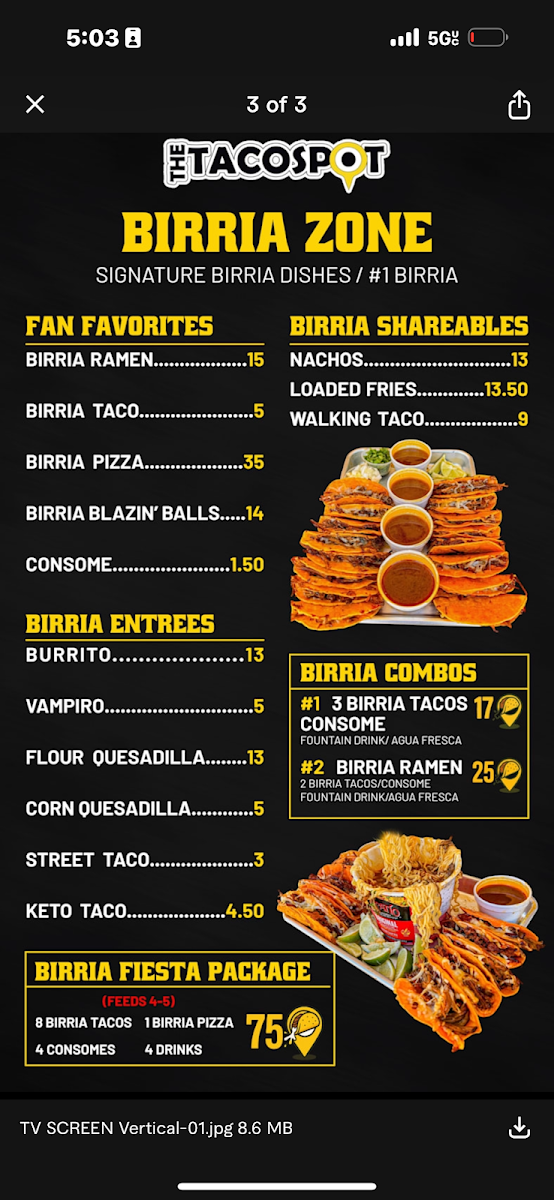 The Taco Spot - Scottsdale offers a vibrant menu that brings authentic Mexican cuisine to the heart of Scottsdale, AZ. Renowned for its expansive taco offerings, the standout dishes include the beloved Birria Combos—featuring tender beef in various forms, like the delectable Birria Ramen and crispy tacos, beautifully paired with rich consome.